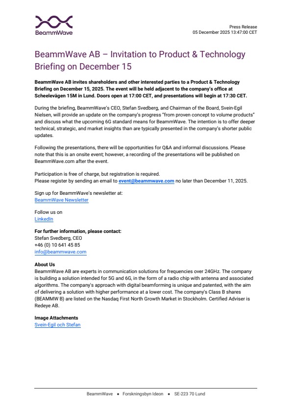 BeammWave AB invites shareholders and other interested parties to a Product & Technology Briefing on December 15, 2025. The event will be held adjacent to the company’s office at Scheelevägen 15M in Lund. Doors open at 17:00 CET, and presentations will begin at 17:30 CET.