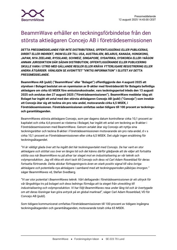 BeammWave AB (publ) (”BeammWave” eller ”Bolaget”) offentliggjorde den 4 augusti 2025 att styrelsen i Bolaget beslutat om en nyemission av B-aktier med företrädesrätt för Bolagets befintliga aktieägare om cirka 65 MSEK före emissionskostnader, vars teckningsperiod inleds den 13 augusti 2025 och avslutas den 27 augusti 2025 (”Företrädesemissionen”). BeammWave meddelar idag att Bolaget har ingått ett avtal med den största aktieägaren Concejo AB (publ) (”Concejo”) som innebär att Concejo åtar sig att teckna sin pro rata-andel, motsvarande cirka 6,5 MSEK, i Företrädesemissionen. Företrädesemissionen omfattas sedan tidigare till 100 procent av tecknings- och garantiåtaganden.