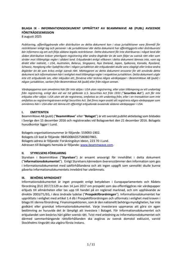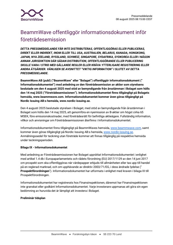 BeammWave AB (publ) (”BeammWave” eller ”Bolaget”) offentliggör informationsdokument (”Informationsdokumentet”) med anledning av den företrädesemission av aktier som styrelsens beslutade om den 4 augusti 2025 med stöd av bemyndigande från årsstämman i Bolaget som hölls den 14 maj 2025 (”Företrädesemissionen”). Informationsdokumentet finns tillgängligt på Bolagets hemsida, www.beammwave.com. Informationsdokumentet kommer även göras tillgängligt på Nordic Issuing AB:s hemsida, www.nordic-issuing.se.