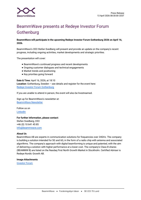 BeammWave will participate in the upcoming Redeye Investor Forum Gothenburg 2026 on April 16, 2026.