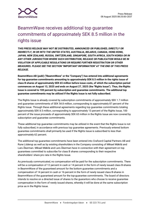 BeammWave AB (publ) ("BeammWave" or the "Company") has entered into additional agreements for top guarantee commitments amounting to approximately SEK 8.5 million in the rights issue of class B shares of approximately SEK 65 million before issue costs, of which the subscription period commences on August 13, 2025 and ends on August 27, 2025 (the "Rights Issue"). Thus, the Rights Issue is covered to 100 percent by subscription and guarantee commitments. The additional top guarantee commitments may be utilized if the Rights Issue is not fully subscribed.