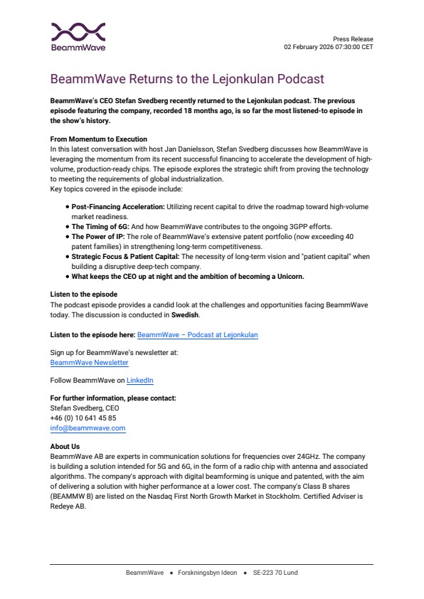 BeammWave’s CEO Stefan Svedberg recently returned to the Lejonkulan podcast. The previous episode featuring the company, recorded 18 months ago, is so far the most listened-to episode in the show’s history.