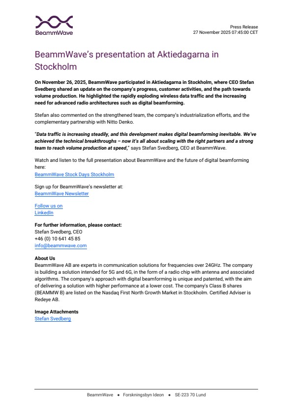 On November 26, 2025, BeammWave participated in Aktiedagarna in Stockholm, where CEO Stefan Svedberg shared an update on the company’s progress, customer activities, and the path towards volume production. He highlighted the rapidly exploding wireless data traffic and the increasing need for advanced radio architectures such as digital beamforming.